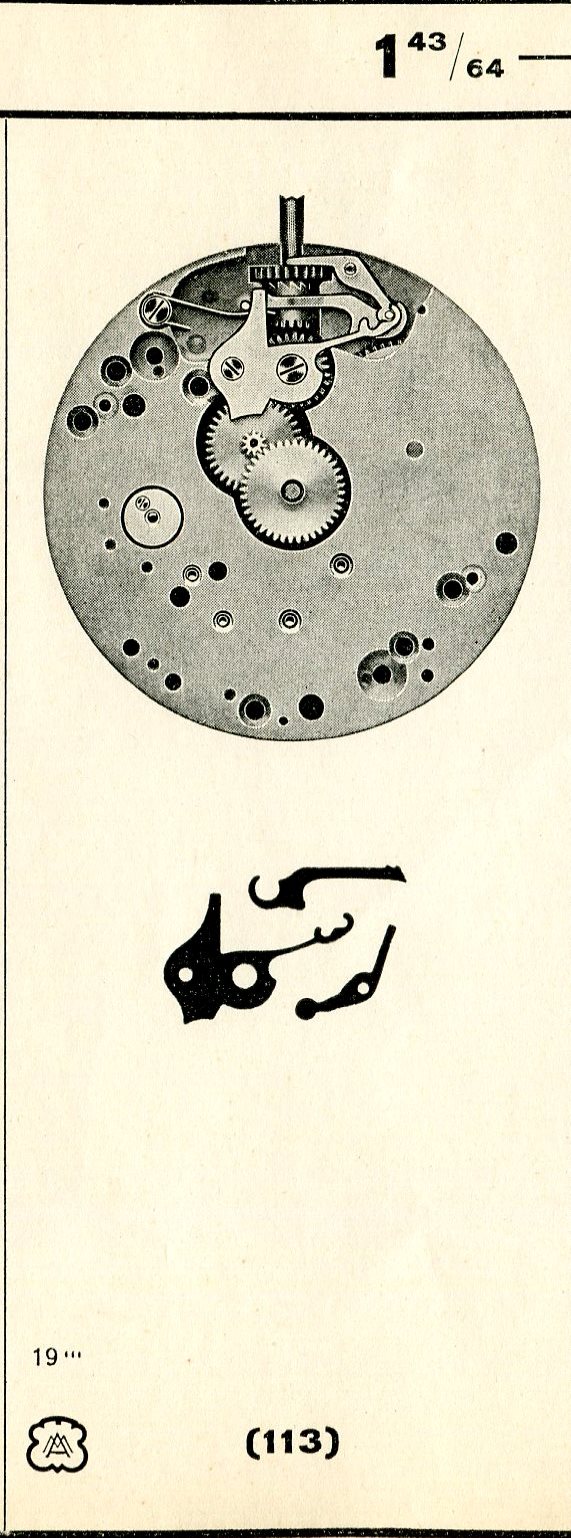 Mitte: AM 113, Modell 167 aus dem Catalogue Général 19/20 der Favoris Watch Co. Rechts: AM 113, Werk Zifferblatt seitig aus dem Ebauches Ersatzteil-Katalog 1949.