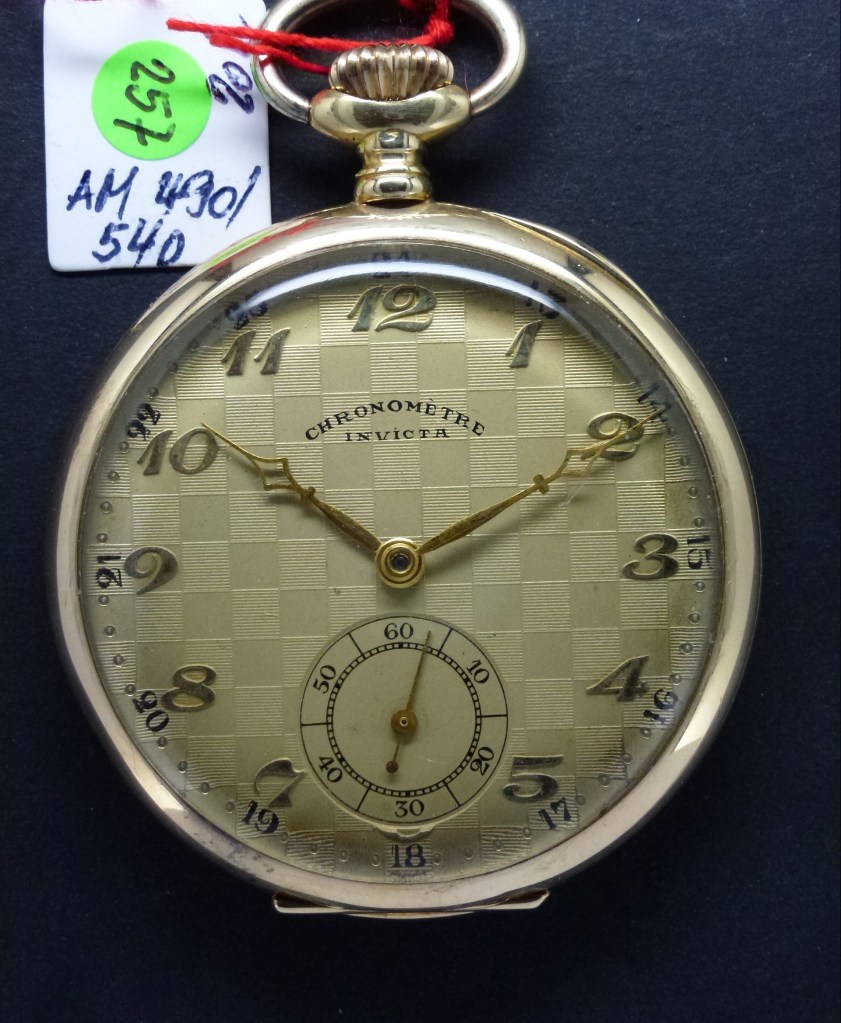 Chronomètre Invicta mit einem Werk AM 490, 15 Steine, 2 arm. Monometal-Unruhreif flach mit Schrauben. Von diesem Werk gibt es bei Invicta auch eine Savonette-Version. Das Werk wurde auch von Helbros, Tellus und Rolex eingesetzt.
